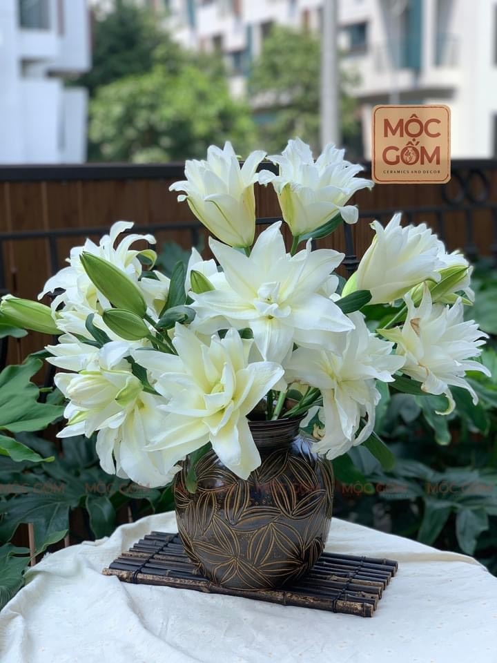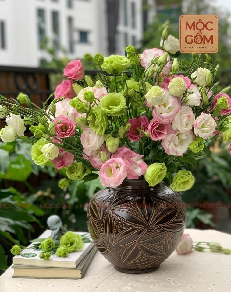 Bình gốm - dáng lu thấp - khắc hoa văn lá nâu