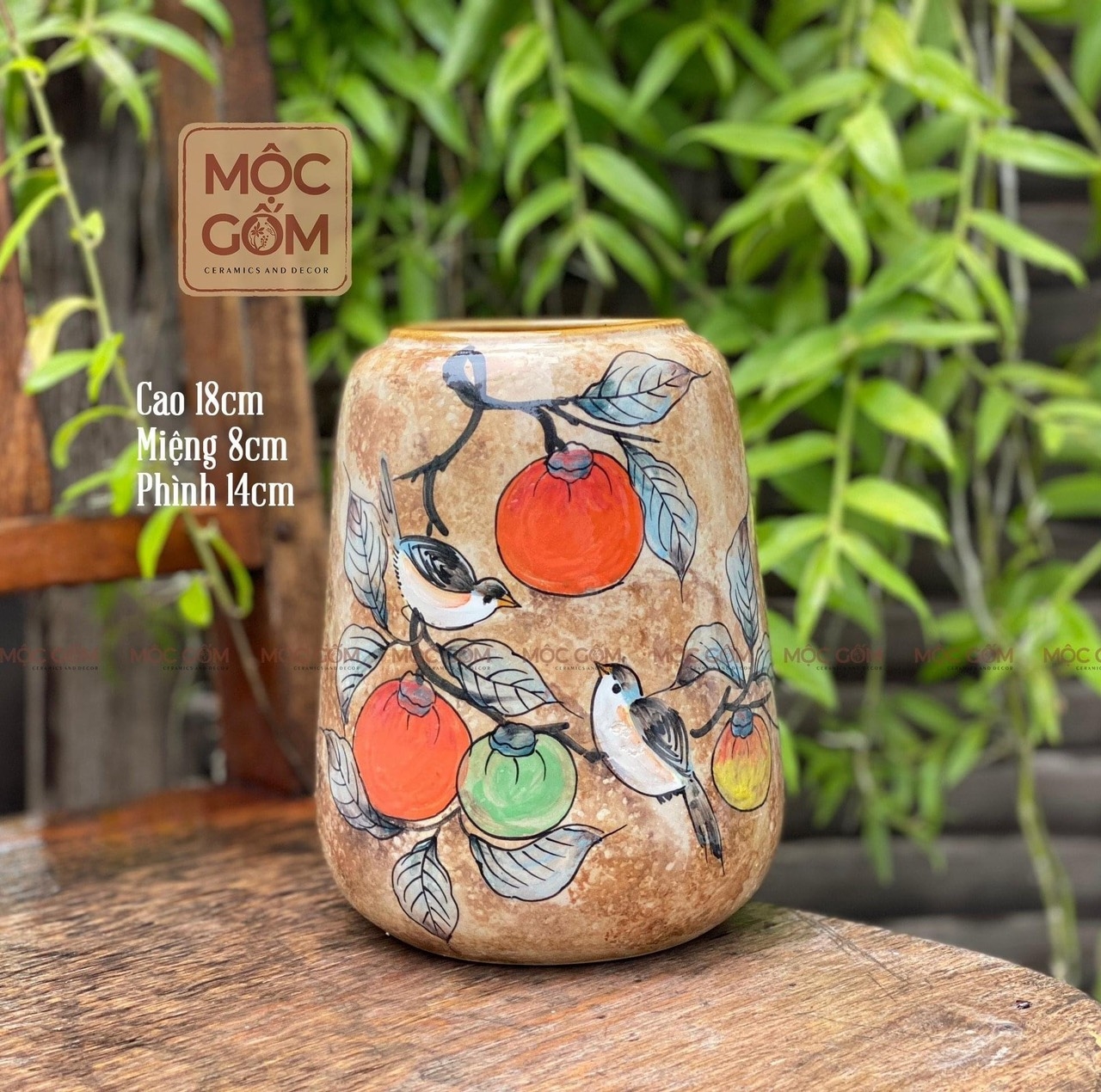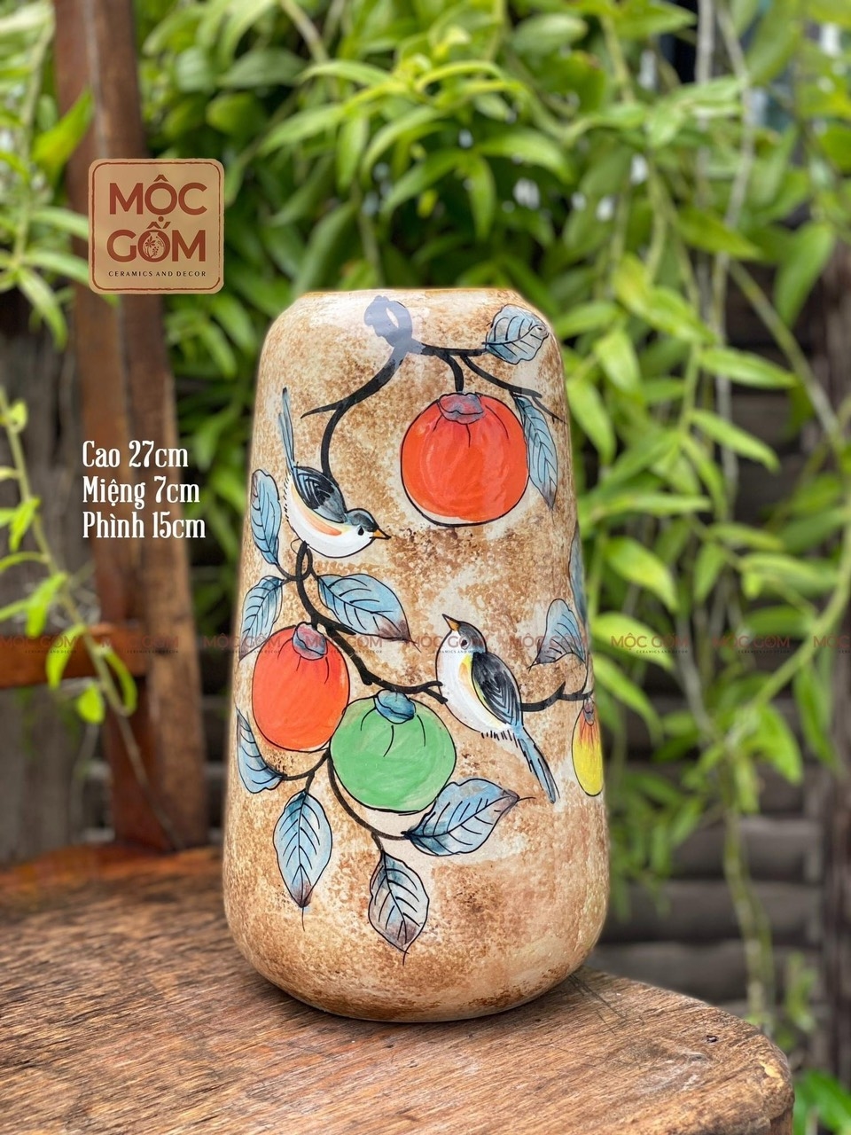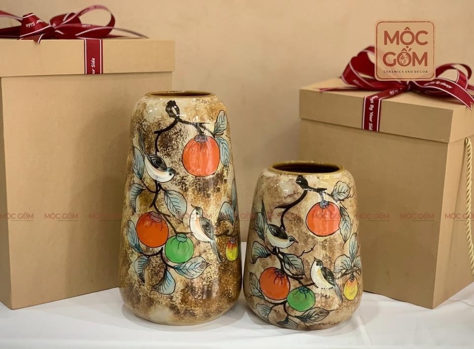Bình gốm - set 2 binh dáng chuông bầu - vẽ cành hồng & chim